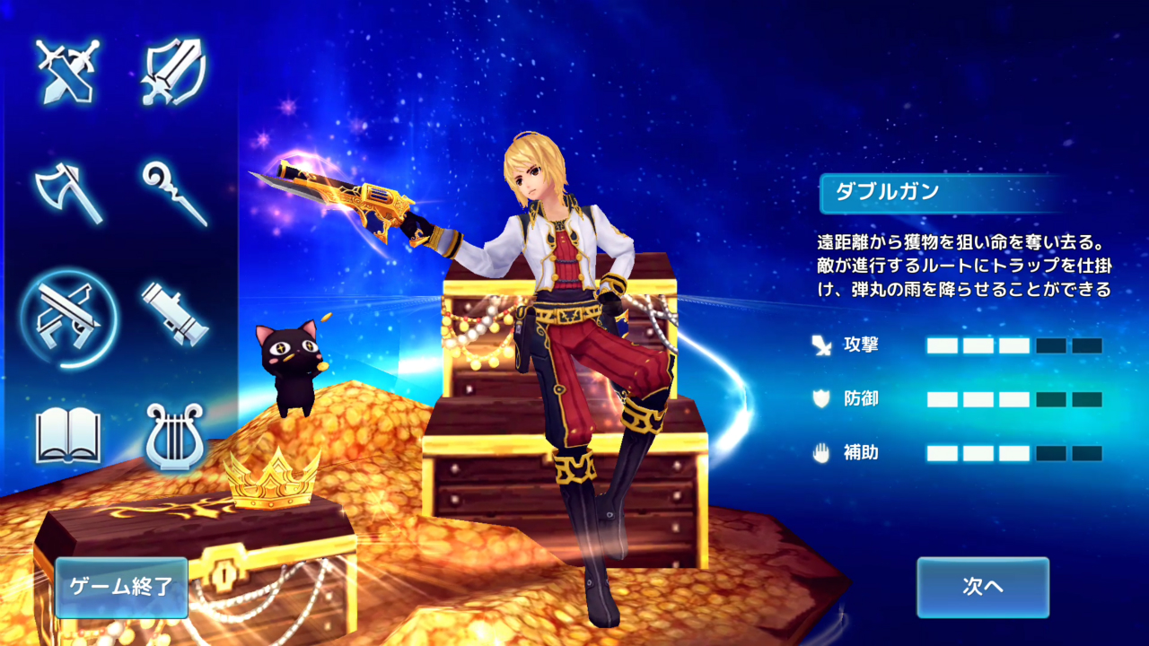 メイン属性:風 スキル回し ①ジャンプ→ソニック→繰り返し ②ジャンプ→ソニック→着地アライン→繰り返し 立ち回り ピョンピョン跳ねながら攻撃、敵の後ろにまわってバックアタックを狙う。 アビリティ 必須アビリティ 「ストライキング」 攻撃時に30%の確率で次のダメージを1倍増加さ説明 ダブルガンの腕が神の領域に達して初めて、最も致命的な弾を打つことができる。 効果 「アライメントショット」を強化 ダメージを15%増加させる。 聖都ナディアにいる「マスター・ドゥーリン」からより効果の高い奥義の書を購入することが幻想神域 ダブルガン このゲームは盾役がどうも必要がない感じなので、別にダブルガンを作って遊んでます。 火力職のが敵倒すの早くて面白いっすよね。 ダブルガンを選んだのは単純に銃がかっこいいかなぁと。 今レベル42まで上がってます。 60位